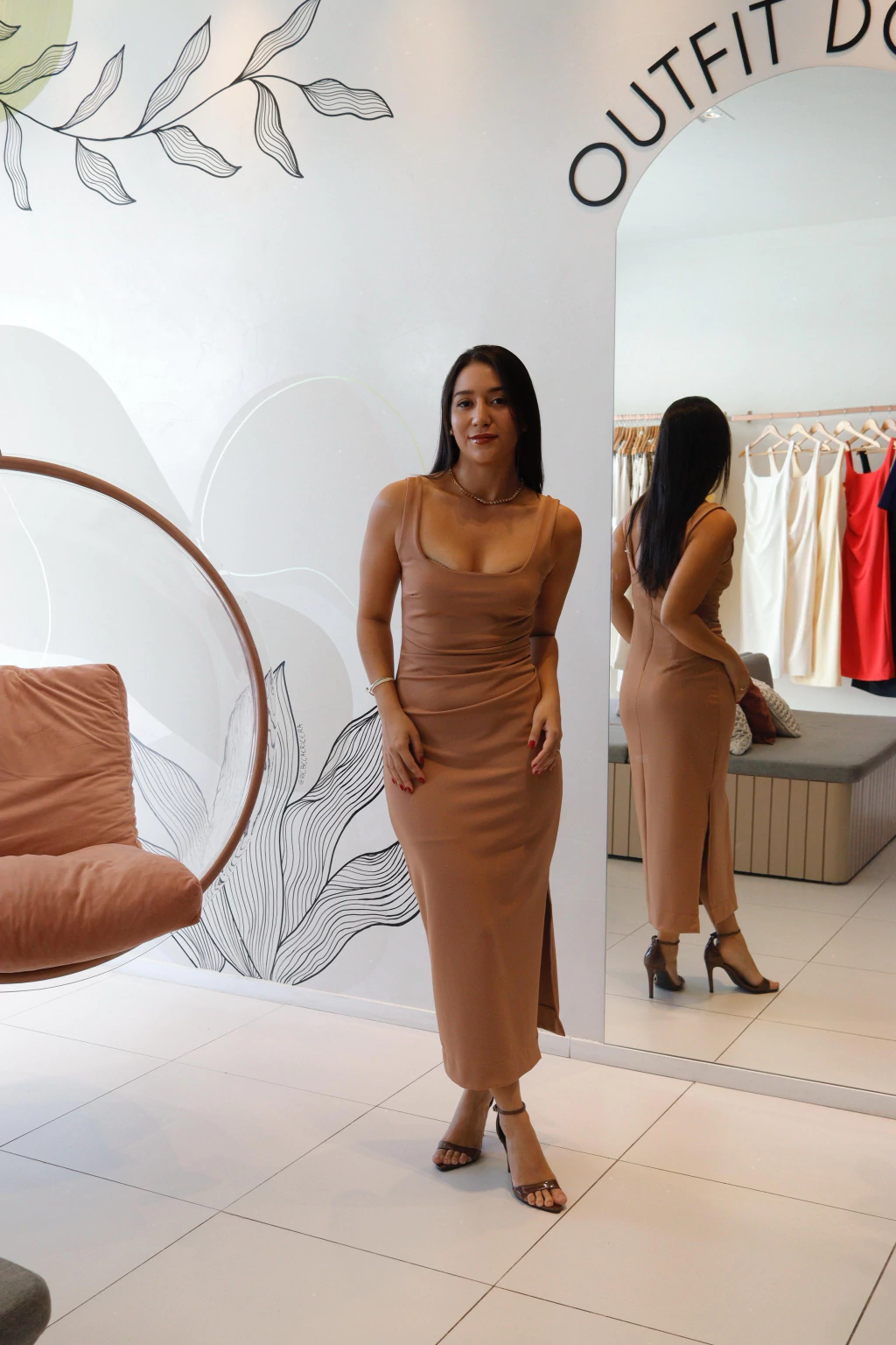 Com decote quadrado que valoriza o colo, o vestido conta com drapeado na lateral, que realça a silhueta de forma delicada. A fenda nas costas adiciona um toque sofisticado, enquanto o forro garante conforto total. Para facilitar o uso, possui zíper atrás, garantindo praticidade e um caimento impecável.